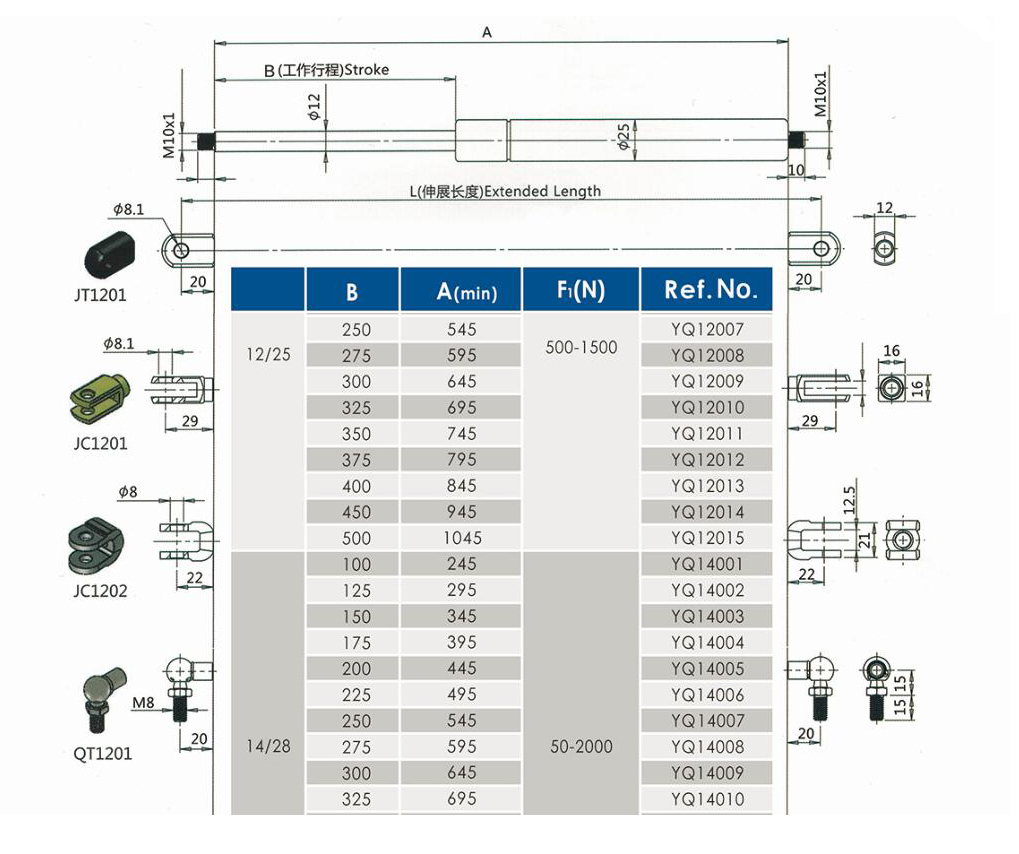 注:由于氣彈簧是非標(biāo)準(zhǔn)的,以上僅為型號(hào)的一部分。我們可以根據(jù)客戶的要求定制。