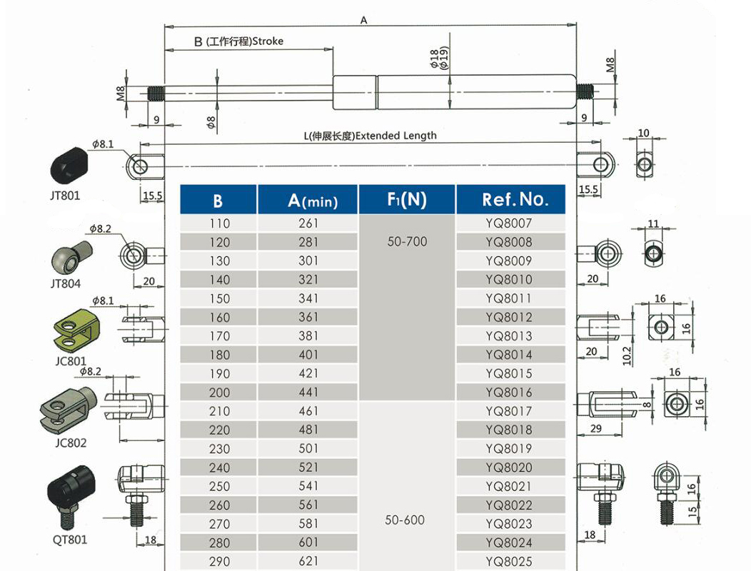 注:由于氣彈簧是非標(biāo)準(zhǔn)的,以上僅為型號(hào)的一部分。我們可以根據(jù)客戶的要求定制。
